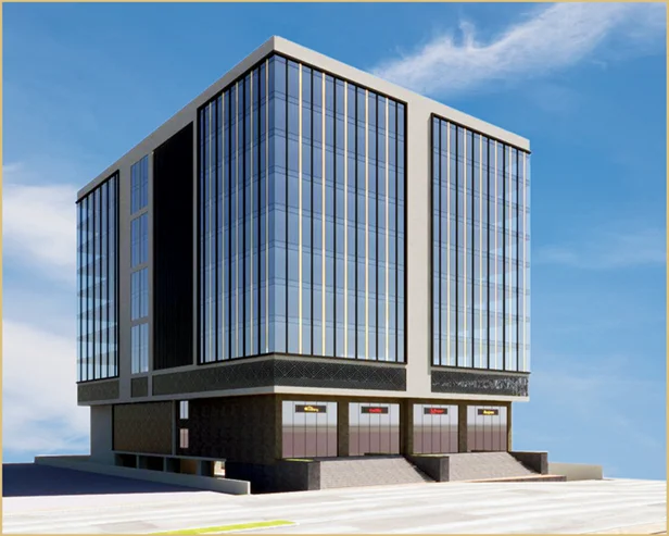 Iconic Design: A modern masterpiece featuring a striking glass facade that reflects a professional and sophisticated corporate image.
