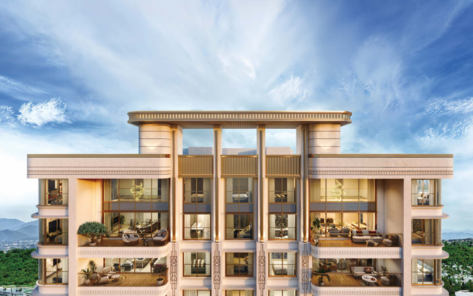 The project offers exclusive 2 and 3-bedroom residences with dramatic crown façades, double-height lobbies, and private elevator access.