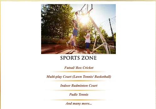 • Sports Arena: Professional courts for Padel Tennis, Futsal/Box Cricket, and Lawn Tennis.
