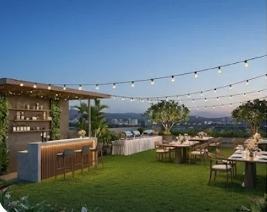 • Rooftop Party Lawn: A landscaped area with a buffet zone and bar counter for hosting events.