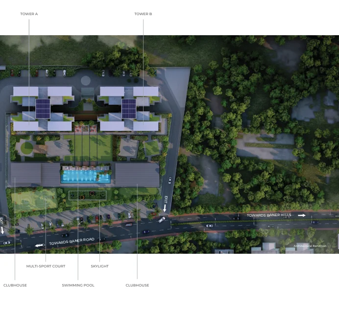 • Location Advantage: Set alongside the majestic Baner Hills, offering scenic views and a hillside living experience.