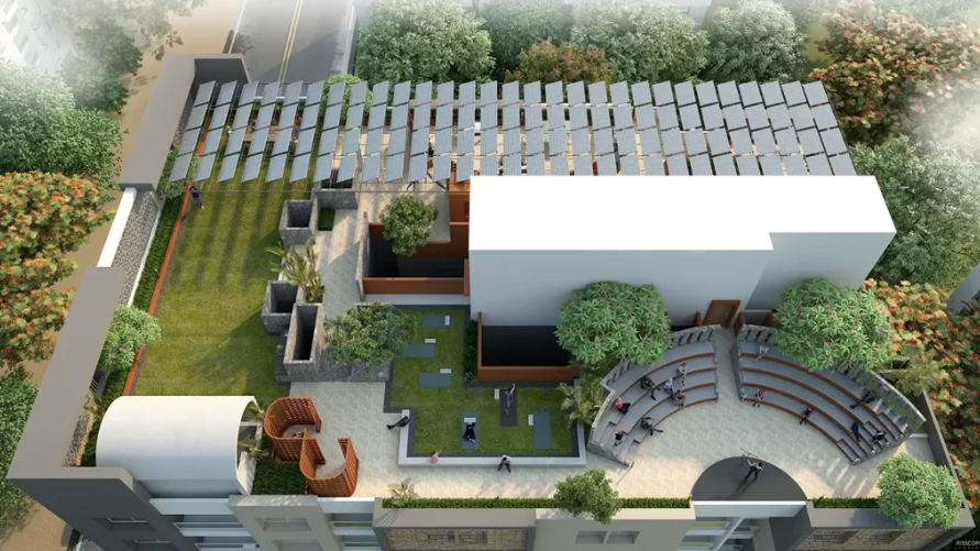 Water Management: Integrated rainwater harvesting and sewage treatment systems.