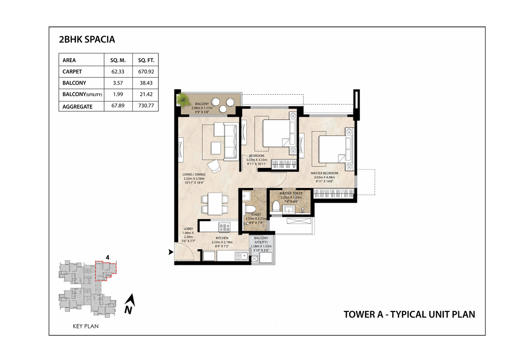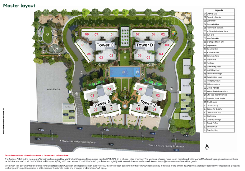 • Comprehensive Master Plan: A gated community comprising multiple towers (A, B, C, D) oriented around a central amenity core.